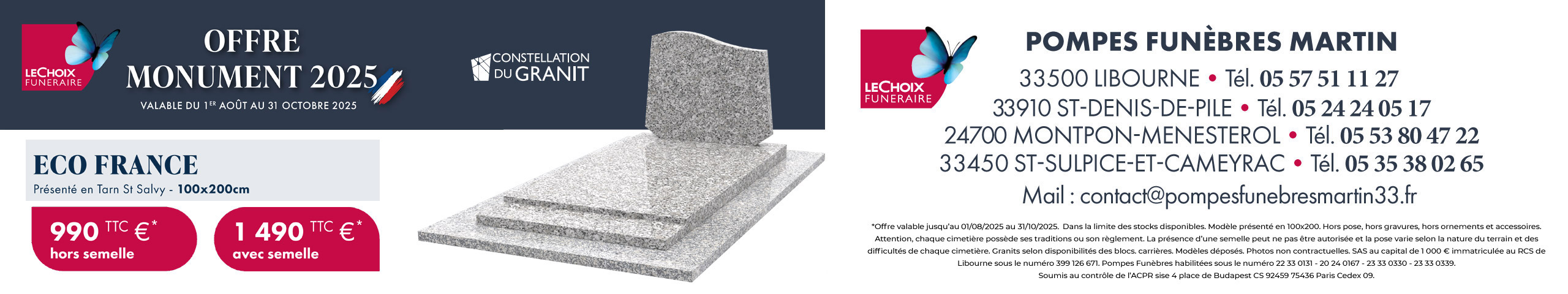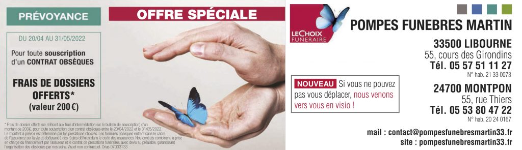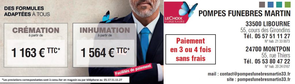 Les POMPES FUNEBERES MARTIN interviennent sur les communes de LIBOURNE (mais aussi sur toutes les communes du département de la GIRONDE, exemples : FRONSAC, COUTRAS, SINT-EMILION, POMEROL, ARVEYRES, VAYRES, SAINT-DENIS DE PILE, SAINT AIGNAN, IZON, GENISSAC, CADARSAC, …) et de MONTPON-MENESTEROL (mais aussi sur toutes les communes du département de la DORDOGNE, exemples : SAINT-MARTIEL D’ARTENSET, MUSSIDAN, SAINT-LAURENT-DES-HOMMES, MENESPLET, MOULIN-NEUF, LE PIZOU, SAINT-REMY, …).